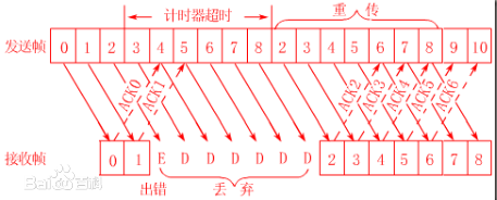 - 如果发方未在规定时间内收到ACK确认帧(即计时器超时),则重发发方缓冲区中的待确认帧。