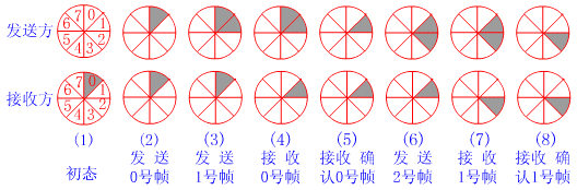 - 在发方,“信息帧”依次发出,其副本被放入重发表中,成为“待确认帧”。重发表是一个连续序号的队列(比如用3位二进制数表示0~7),副本帧进入重发表时被自动赋予序号。