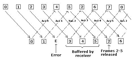 - 收方收到多帧,如果中间有少量帧出现错误,其后续帧没有错误,那么就把后续的正确帧先放入缓存,向发方返回错误帧的“否认帧”NAK。
